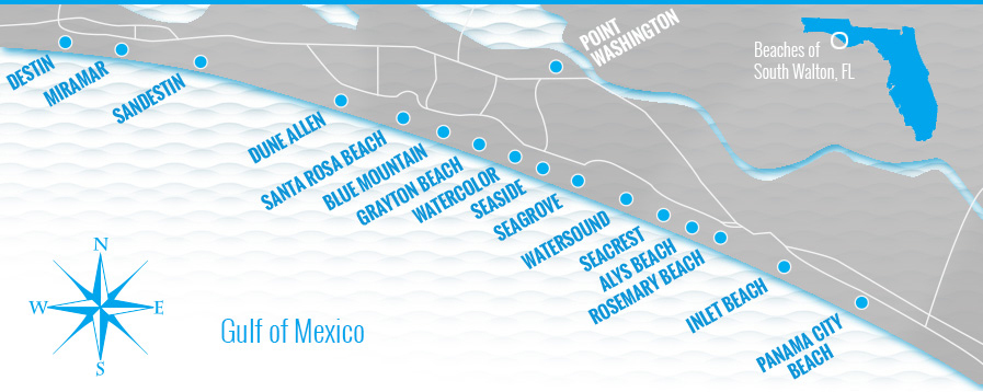 30a beach map. It stretches along 24 miles of the emerald coast famous for its azure waters and white sand beaches. Inspired by a two lane road that meanders along floridas gulf coast 30a isnt just a line on the map. Discover restaurants shops and other things to on scenic 30 a as your explore this quaint town on floridas emerald coast.