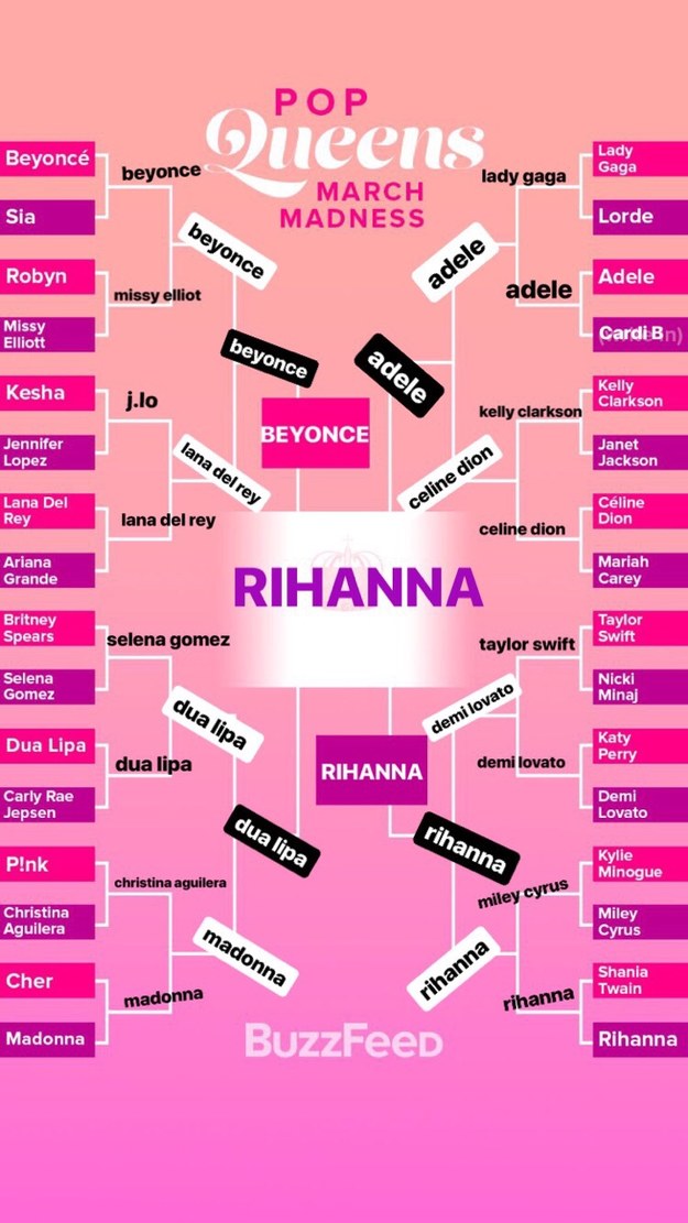 We chose 31 iconic living pop queens for our bracket and you get to choose a 32nd for a write in spot to square off against adele in the first round. Get all the best moments in pop culture entertainment. Search watch and cook every single tasty recipe and video ever all in one place.