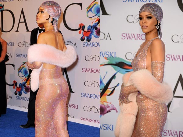 She wore a sheer cut out crystal embellished gown.
