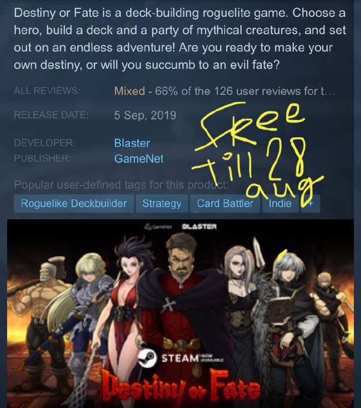 Are you ready to make your own destiny or will you succumb to an evil fate. Get if free for 24 hours only on steam. Choose a hero build a deck and a party of mythical creatures and set out on an endless adventure.