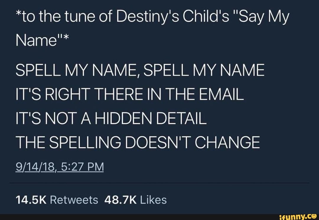 To The Tune Of Destiny S Child S Say My Name Spell My Name Spell My Name It S Right There In The Email It S Not A Hidden Detail The Spelling Doesn T Change In 2020
