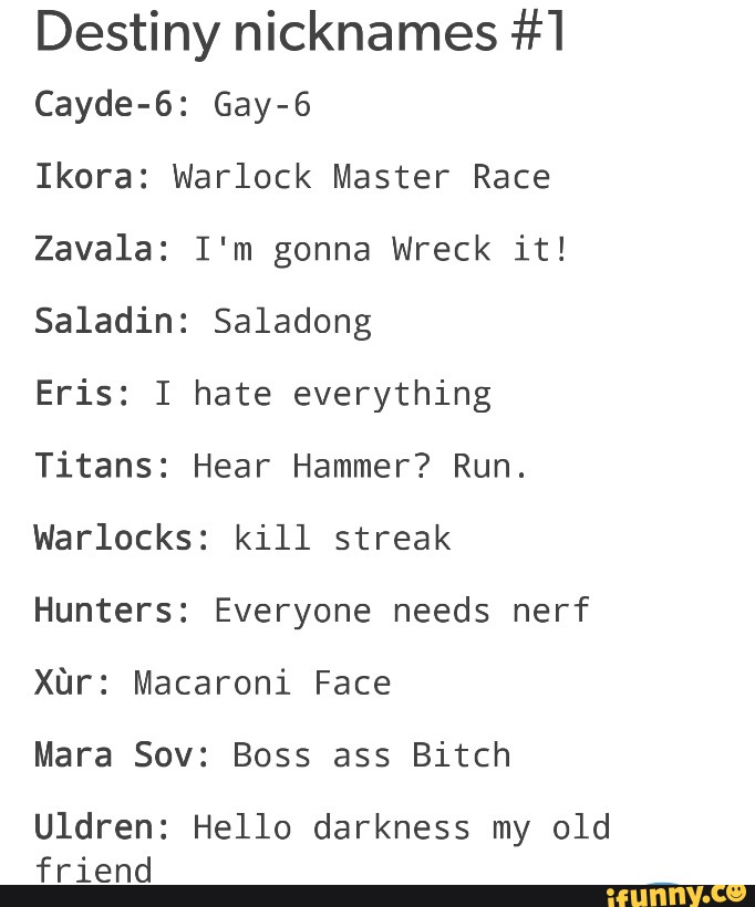 I didnt love having in exo but i feel weird deleti. Warlocks are the master race and heres why updated at the request of the sunbros the following points are incontestable facts of life try not to cry uncontrollably as you delete your pathetic titanhunter from existence submit to the warlocks. So are destiny 2 memes.
